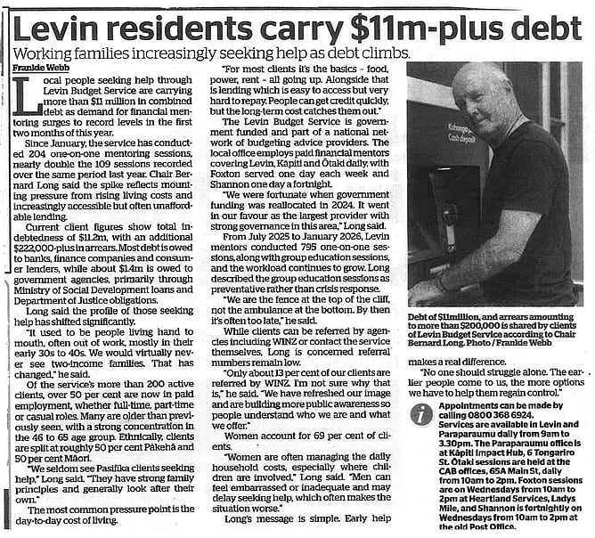 Local people seeking help through Levin Budget Service are carrying more than $11 million in combined debt as demand for financial mentoring surges to record levels in the first last months of this year.